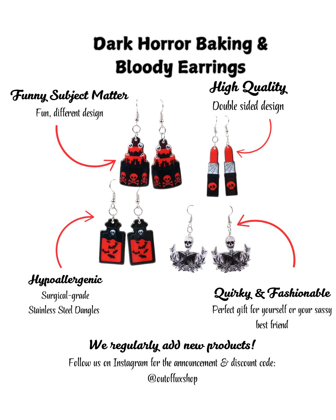 These striking Gothic Skull Jewelry pieces feature a black dangle design with vampire-inspired details, making them perfect alternative accessories for goth bakers and Halloween enthusiasts alike. Crafted with metal hooks, these dark jewelry pieces are ideal as a unique gift for horror fans, combining chilling aesthetics with high-quality construction.