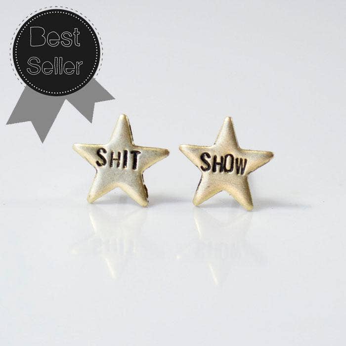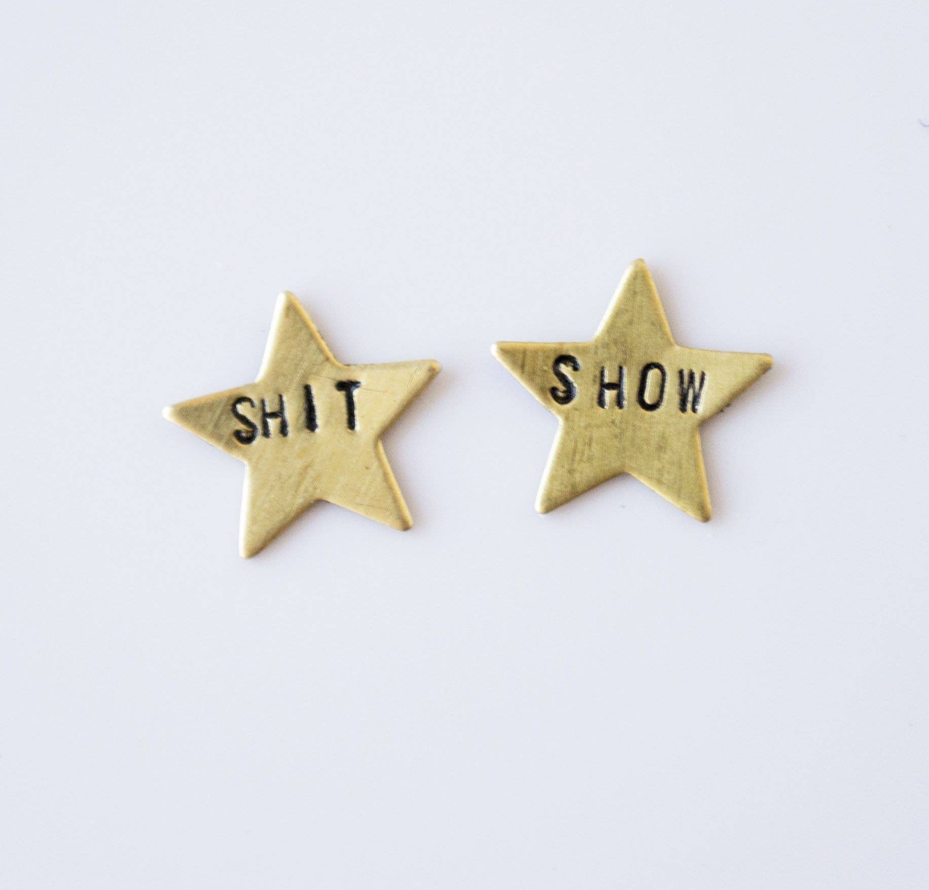 Hand Stamped, star shaped, earrings that read "SHIT SHOW". These earrings are far too truthful these days...