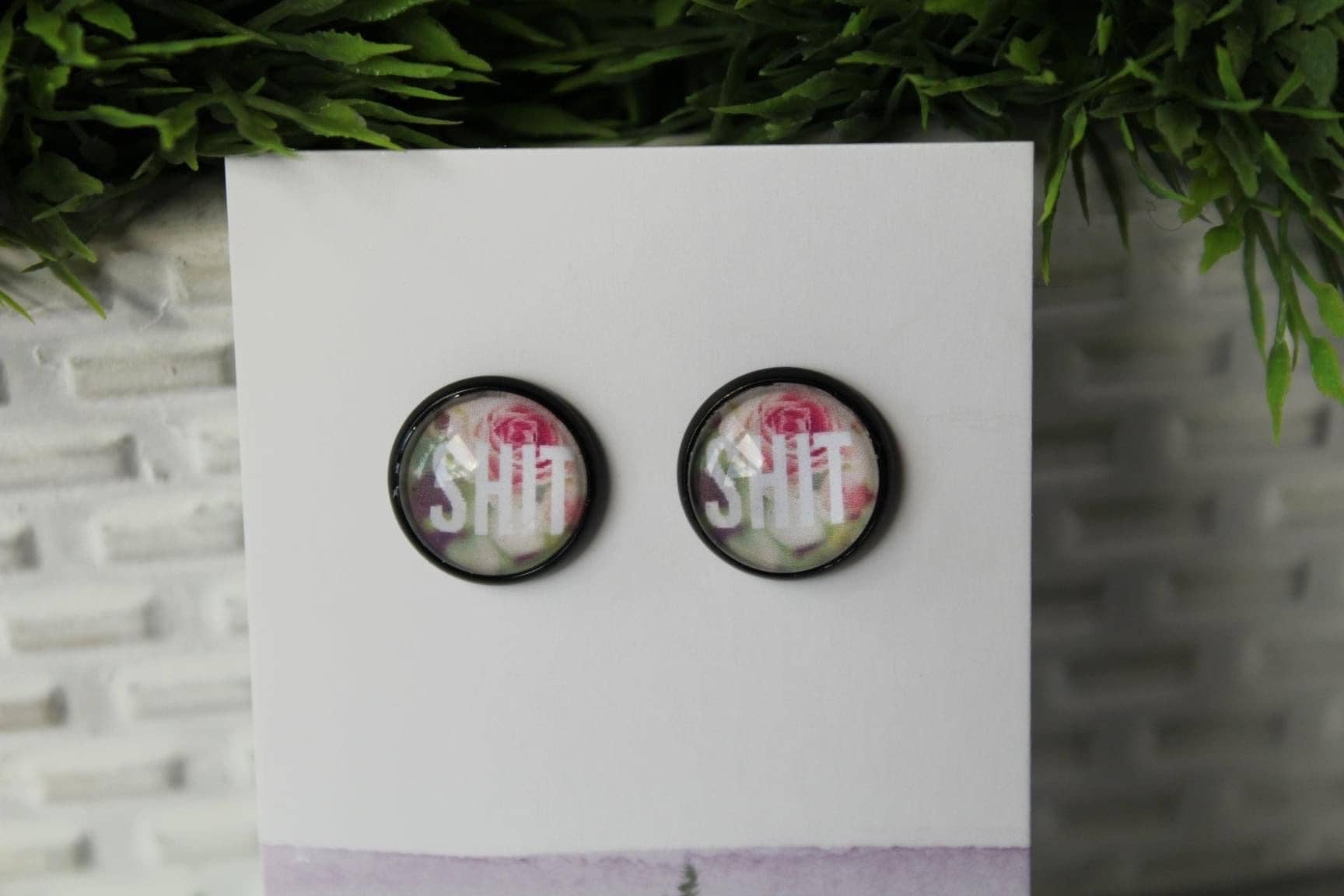 Black and Floral Shit Stud Earring - Dainty Cute and Fun - Not for Karens